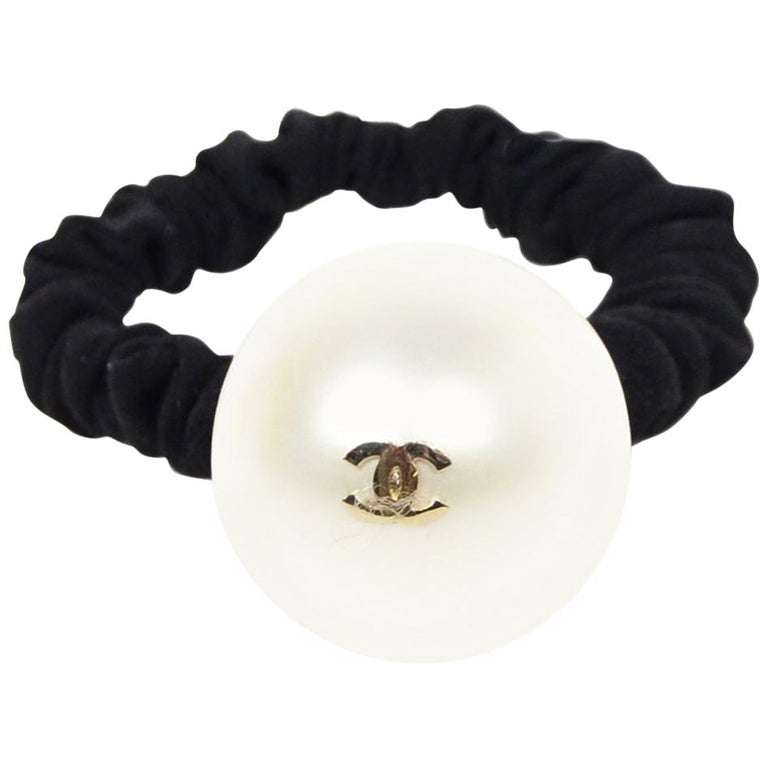 Chanel 18 Black Hair Tie Scrunchie W Pearl And Goldtone Cc For Sale At 1stdibs Chanel Scrunchie Chanel Pearl Hair Tie